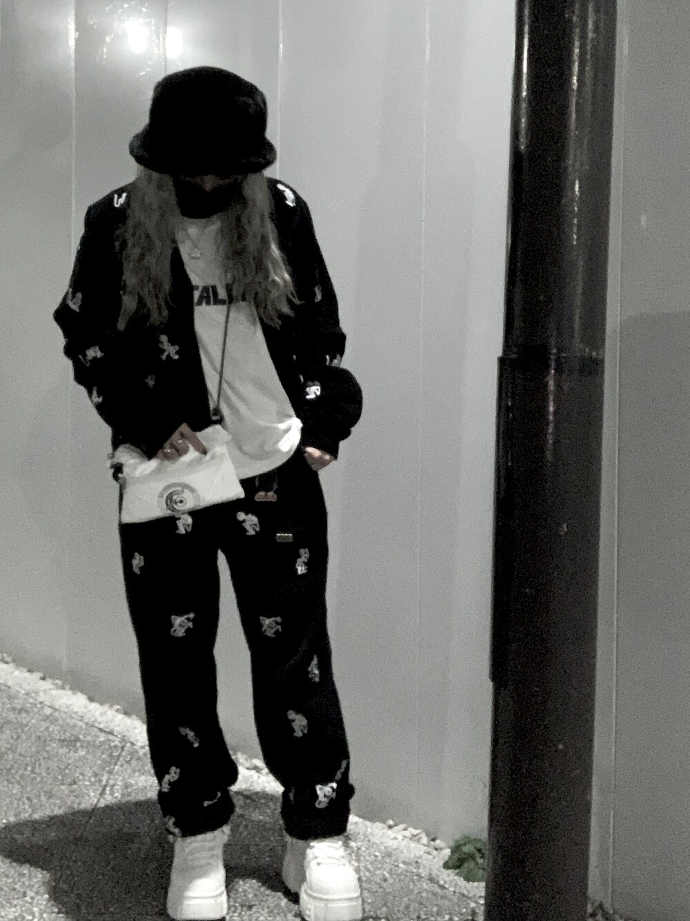モノトーン👽🖤🤍 インナーはMETALLICAのTシャツで ネックレスとサコッシュが CROSSFAITHでROCK🤘🏾🔥🔥 ファーのバケハと コーデュロイのセットアップ💨