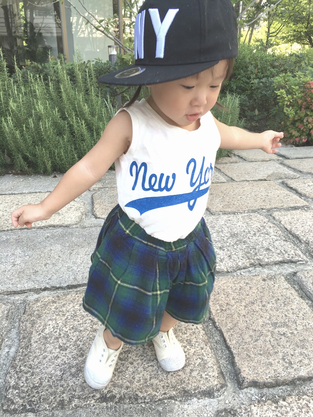 暑いから色味だけ秋を意識して◡̈ 保育園にも着て行けるアイテムで、いかにかわいくできるかチャレンジ中!