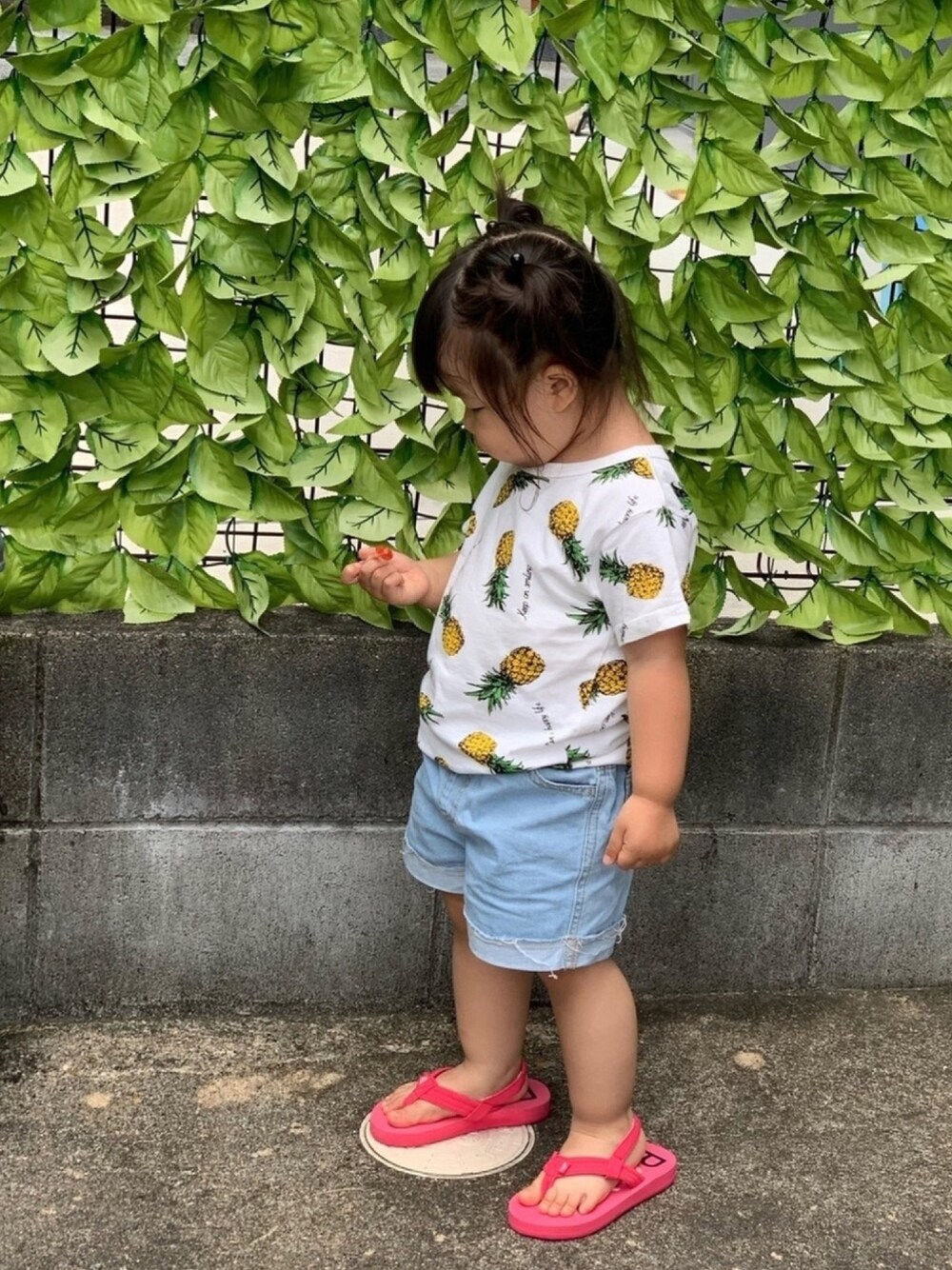 いつも♡+コメント、フォロー、フォルダ🗂 入れてもらってありがとうございます❤ 全部嬉しいです☺️✨ 帰省中コーデ✨ #パイナップル🍍T ブランシェスで一目惚れして 姪っ子甥っ子とおそろでゲット❤️❤️❤️ 最近パイナップル🍍とスイカ🍉柄 みると欲しくなる〜💓💓💓 もともとプチプラなのにさらに安く☺️💕 もうすぐ5歳なる姪っ子と同じ110なのに 違和感なく着る娘😂 サンダルはムラスポ信者(笑)のパパが 海用にと買ってくれました✨ ブラックと迷ってたら娘がピンクが いいと☺️ 好みがでてきたなぁ〜🤔