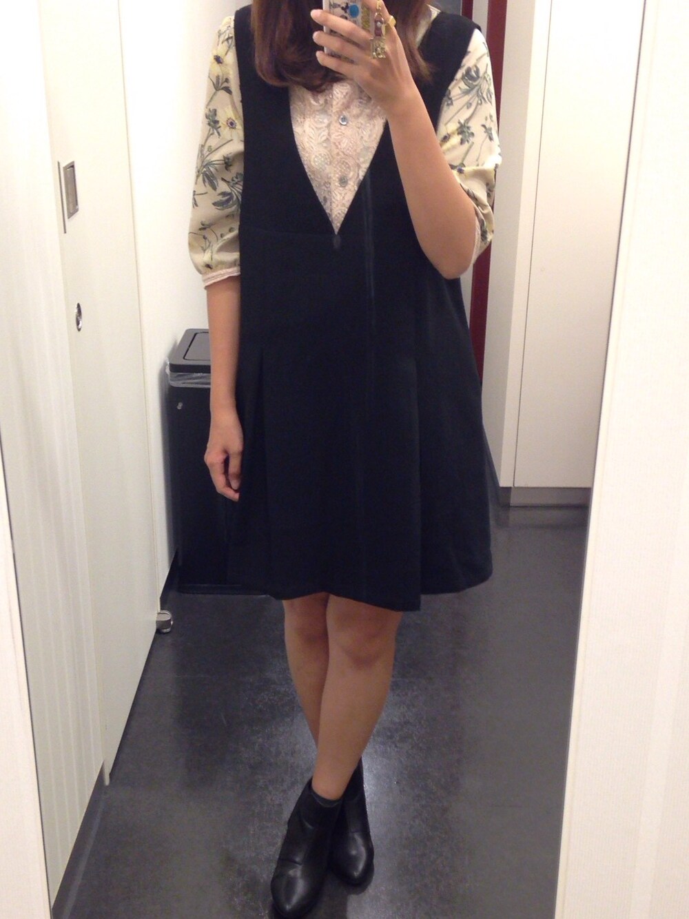 ジャンスカ楽ちん☺︎ 今日はハイネックのブラウスに合わせました 最近よく買うomekashiで(*^^*)👖 足元は可愛くなりすぎないように、低めの革ブーツ👢