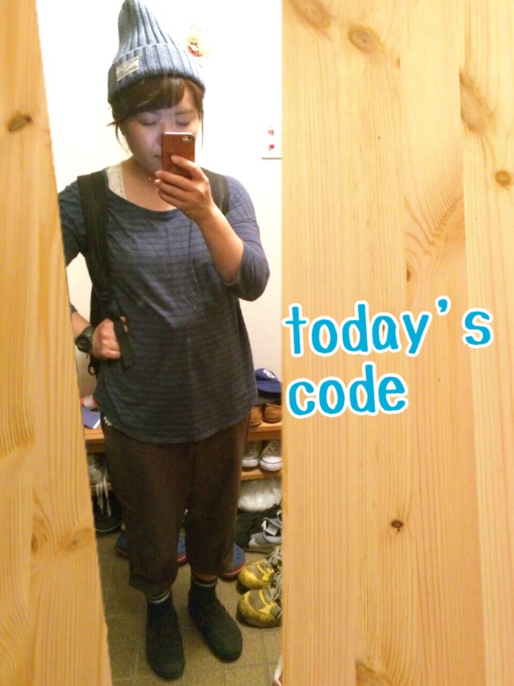 ボーダートップス、靴下:UNIQLO あったかかったので 久々のアウターなし( ´ ▽ ` )ノ ブルー系で統一して ニット帽をかぶってみました♫