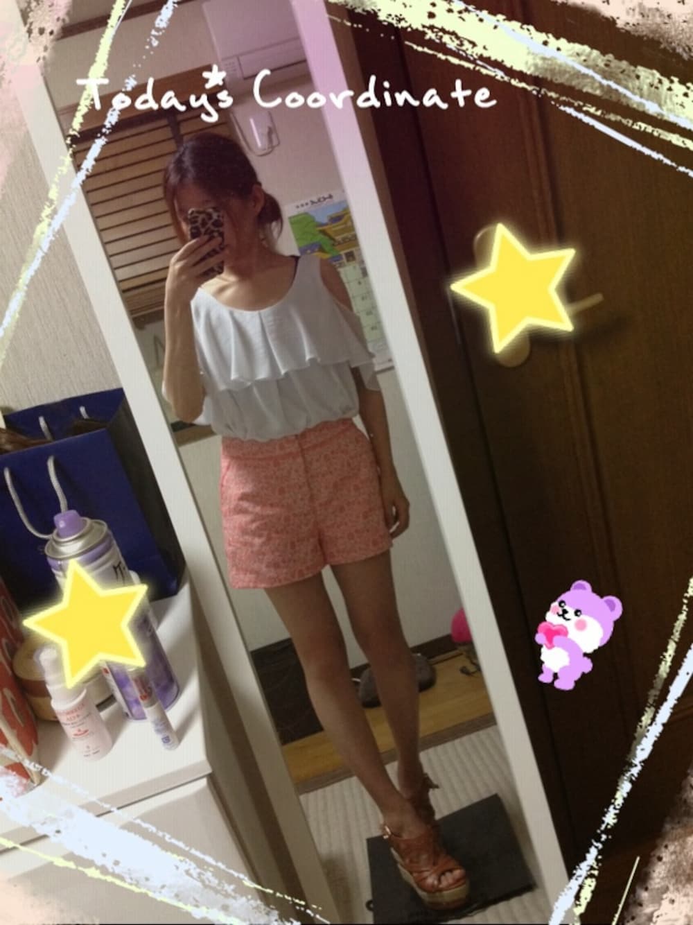 またまた、ショートパンツ買ったので来てみたコーデ꒰✩'ω`ૢ✩꒱♡ 珍しくピンク系買った✨ ピンクには白しか合わせ方分からない為これ履く時はこのブラウスが定番になりそうだ꒰⁎×﹏×⁎꒱՞༘✡