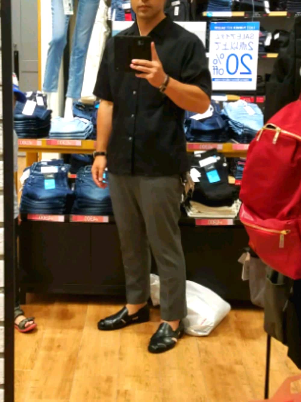 買い物で姿見があったので、とってみました。 オープンカラーシャツ、とりあえずきてみました。 guのイージーパンツは、センタープレスつけました。 ZARAのレザーオープンシューズがお気に入りです。