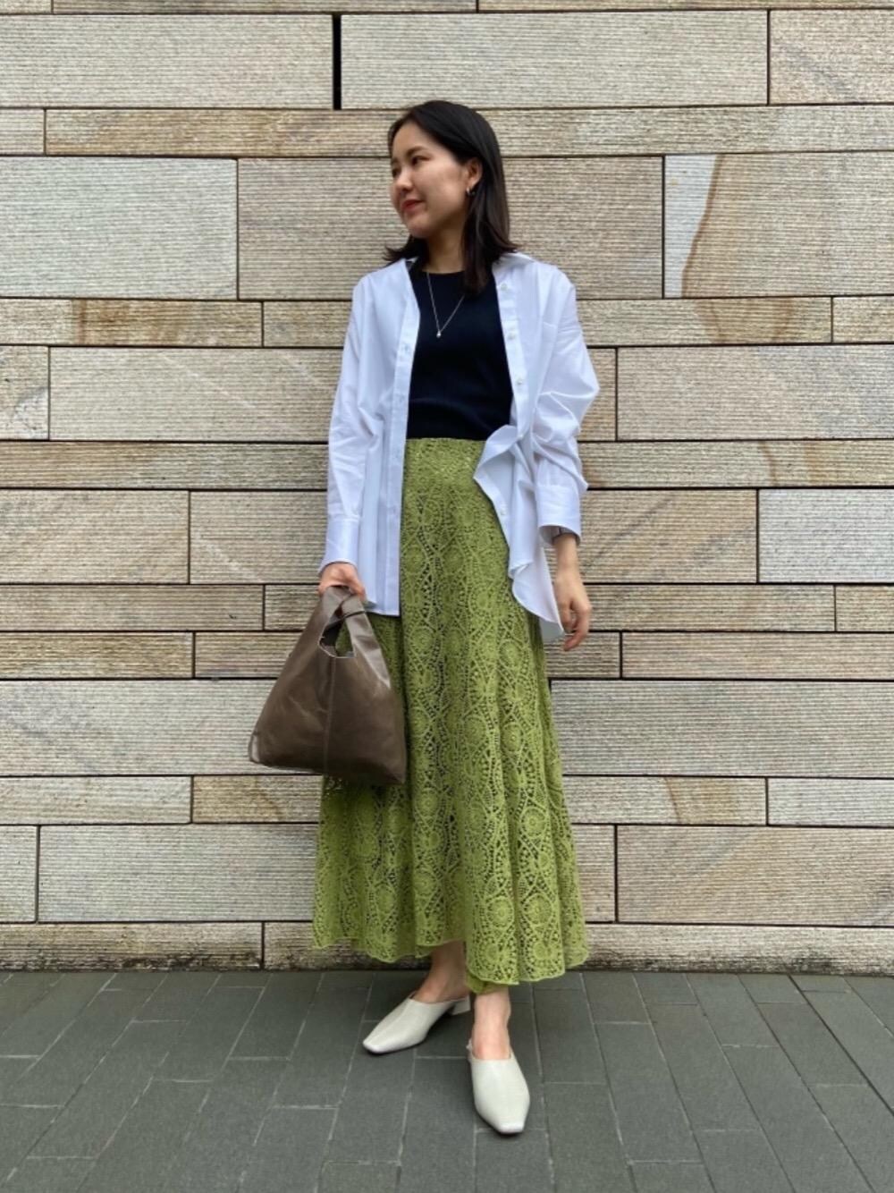 身長:165cm 普段サイズ:アウター38/ボトムス38/シューズ23.5cm 【サイズ感】 シャツ:身幅、丈感ややゆったり ボトムス:ややゆったり、長め シューズ:標準的 【コーディネートポイント】 メンズライクになりすぎないようにシャツをスカートで合わせ、女性らしい印象にしました。シャツはややゆったりめなのでTシャツや長袖の上に今から秋まで羽織っていただけます。