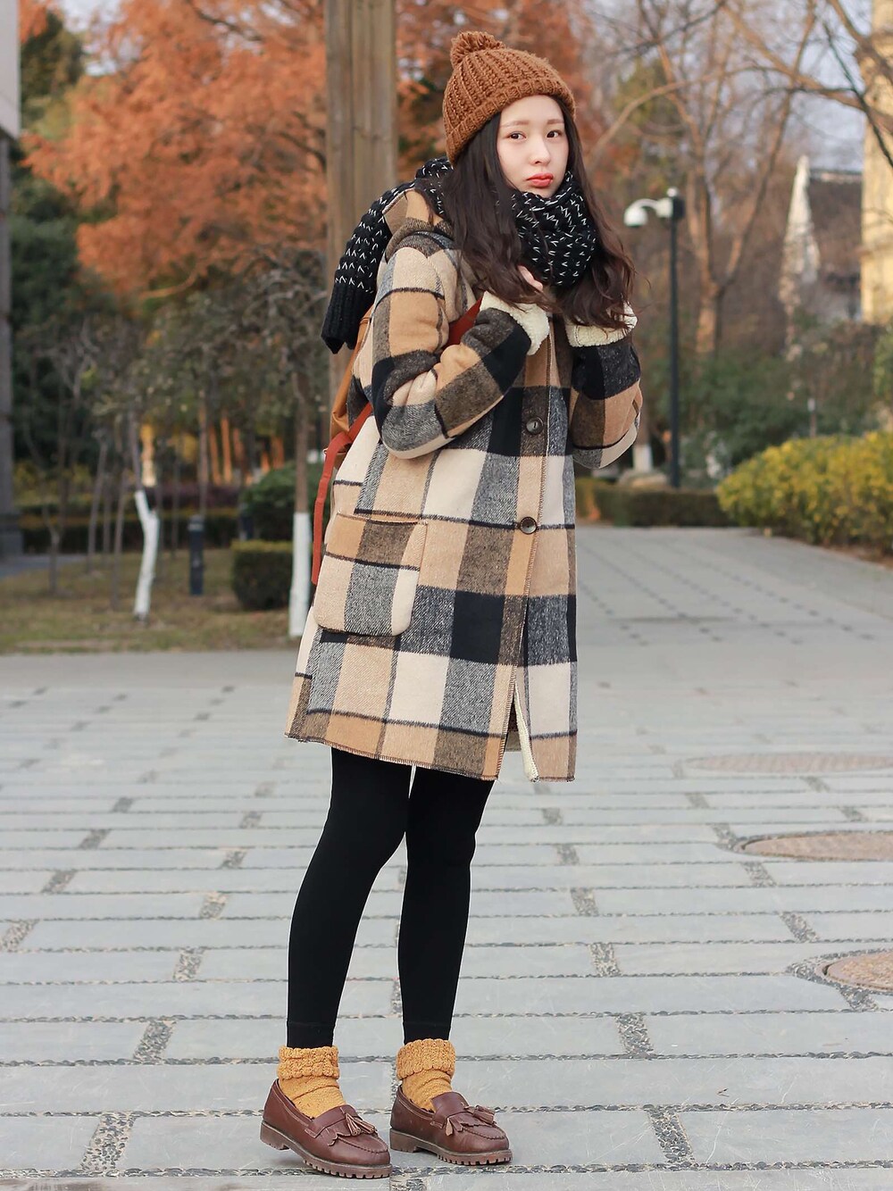オレンジ系のピーコートを着用したレディースの冬コーディネートの1枚目の写真