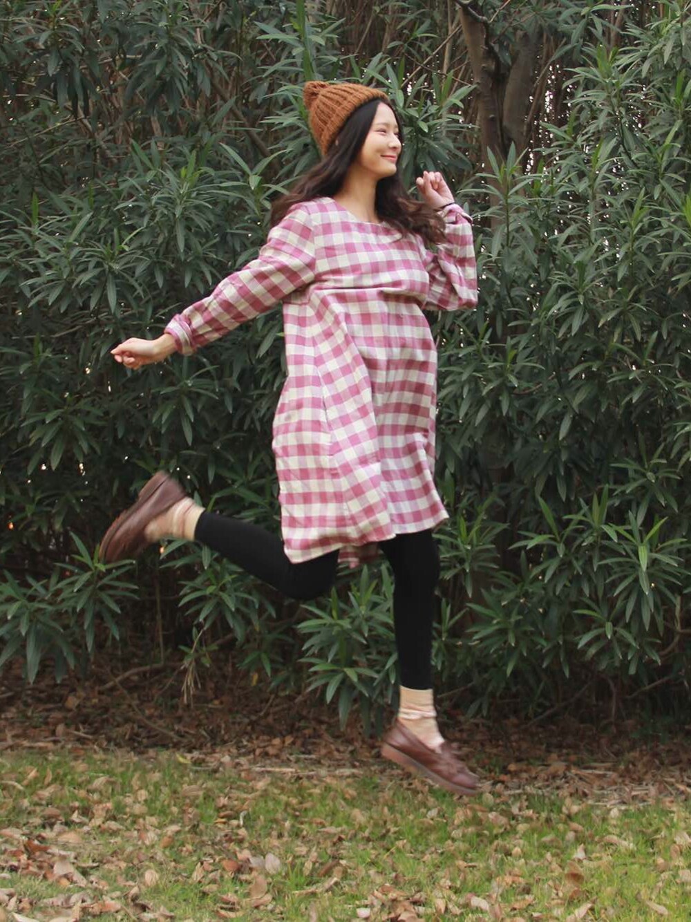 ピンク系のワンピースを着用したレディースの冬コーディネートの1枚目の写真