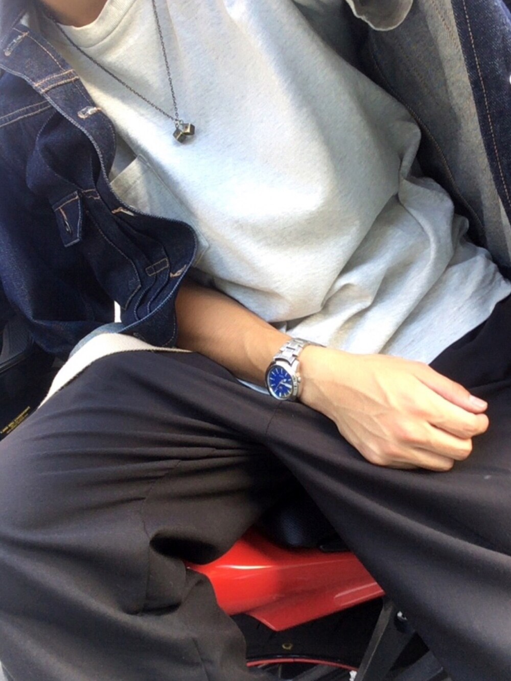 ご覧いただき、ありがとうございます😊 もう少し肌寒くなってきましたね‥ ということで、デニムジャケット!! バイクに寄りかかりながら撮ってみました😆 秋を意識してみました✨ 低身長が悩みです‥😭 コーディネート 無地Tシャツ ワイドパンツ デニムジャケット