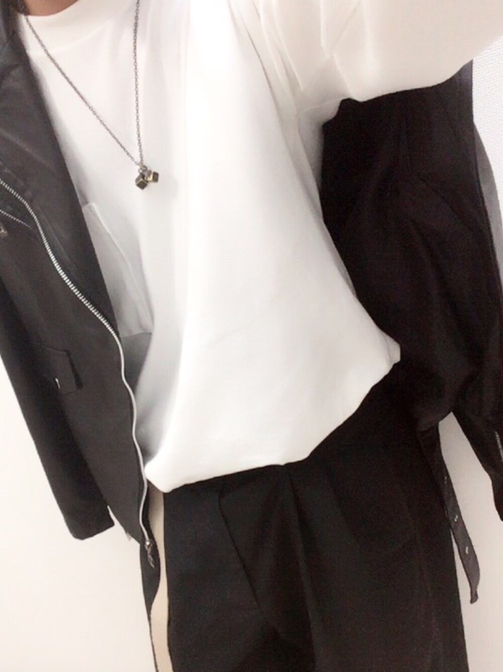 ご覧いただきありがとうございます😊 モノトーンコーデ!! タックインにライダースジャケットを羽織るコーディネート。 白黒統一のシンプルコーデです! コーデ #白シャツ #ガチャベルト #ワイドパンツ #ライダースジャケット #ネックレス