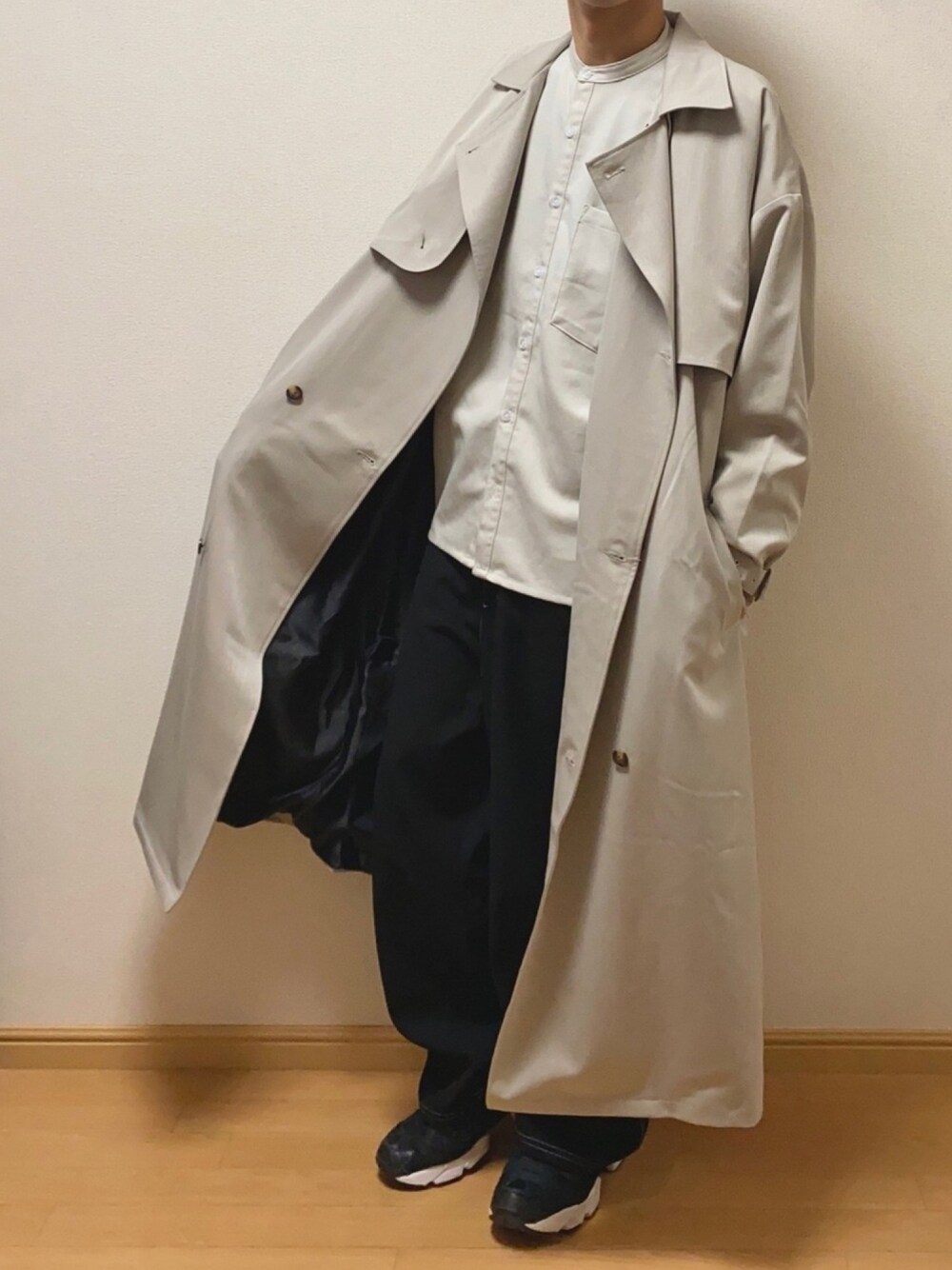 Naoのトレンチコート「TRストレッチ オーバーサイズ ヨークトレンチコート/オーバーコート EMMA CLOTHES」を使ったコーディネート