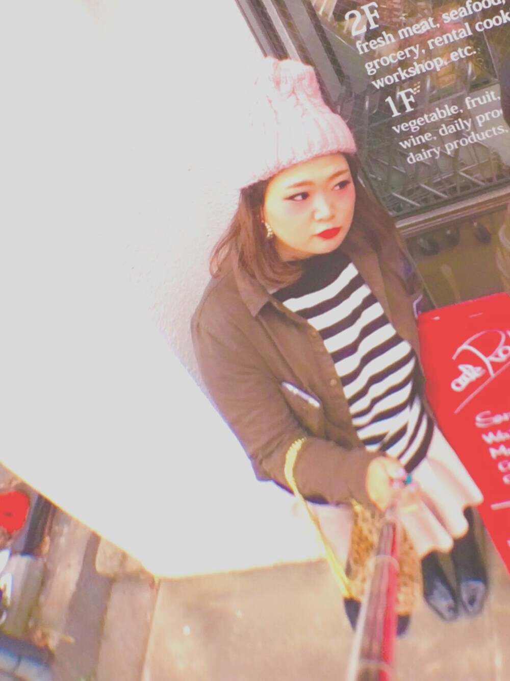 グリーン系のミリタリージャケット、ピンク系のニットキャップ/ビーニーを着用したレディースの冬コーディネートの1枚目の写真