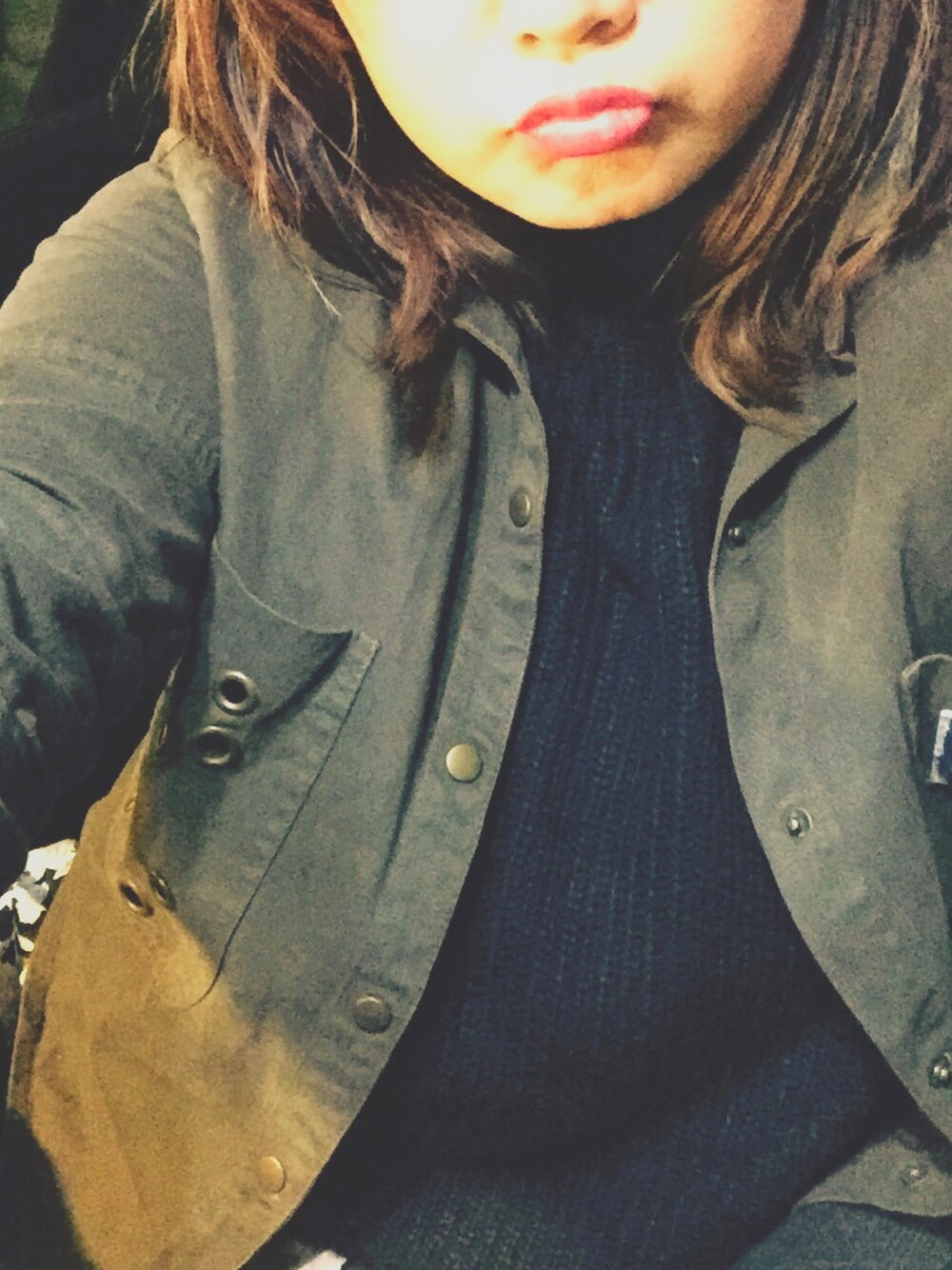 グリーン系のミリタリージャケットを着用したレディースの冬コーディネートの1枚目の写真
