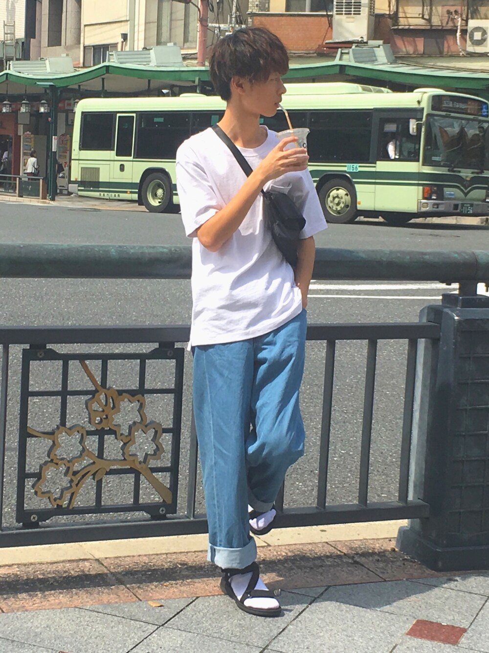 . . . . . . ワイドデニムとビックTで爽やかに🐒 足元は涼しくスポサンに白の靴下を合わせました🙈 サコッシュは差し色で黒を入れました🙌