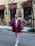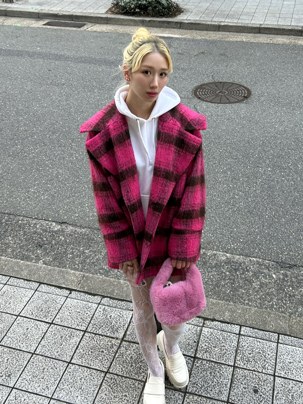 ピンクのコートに白レースタイツでラブリーにしつつもフーディーで少しカジュアルにしてみました♩