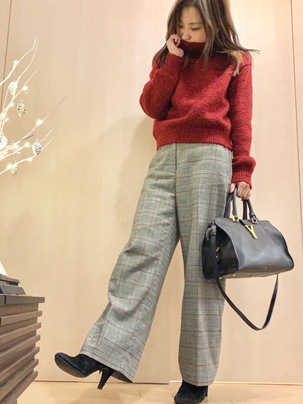 こんにちは ご覧いただきありがとうございます😊 【仕事用コーデ】 厚手のニットの出番になりましたね UNIQLOで見つけた 赤っぷりが可愛いハイネックニットを メインにしたコーデにしました ニットが短めなので ワイドパンツでバランスを オフィスが暑くて あちーあちー言ってました(笑)