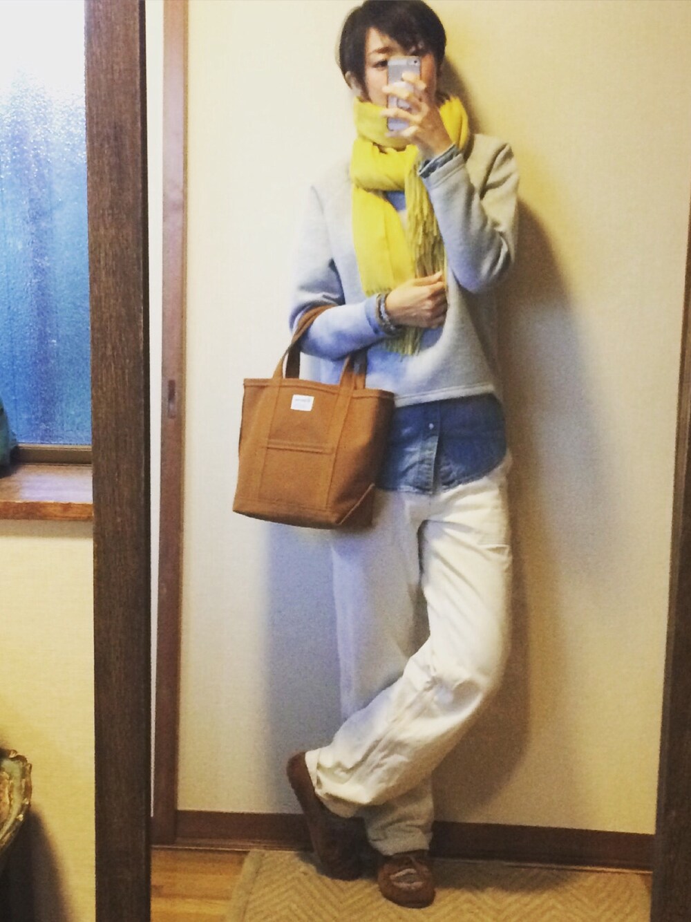 黄色をポイントに。スウェットPeachJhon、デニムシャツgap、パンツJOURNAL STANDARD、バッグOrcival、靴minnetonka、アクセサリーSENBA。 #style #fashion #outfit #gap #PeachJhon #SENBA
