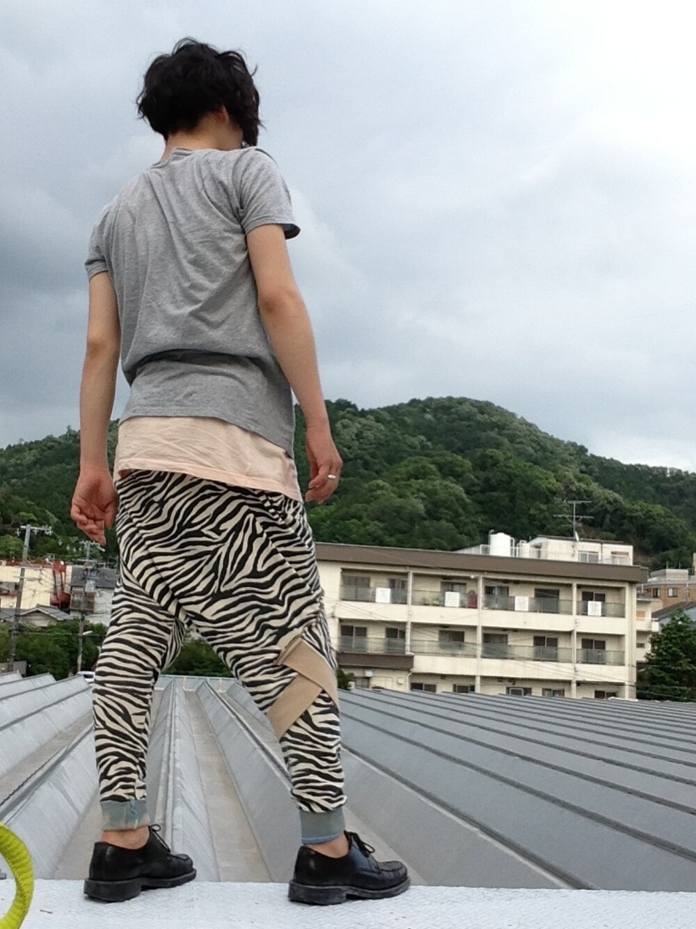 ロング丈のタンクトップにカットソーで重ね着してパーカーをリメイクして作ったサルエルパンツをシンプルに合わせました。