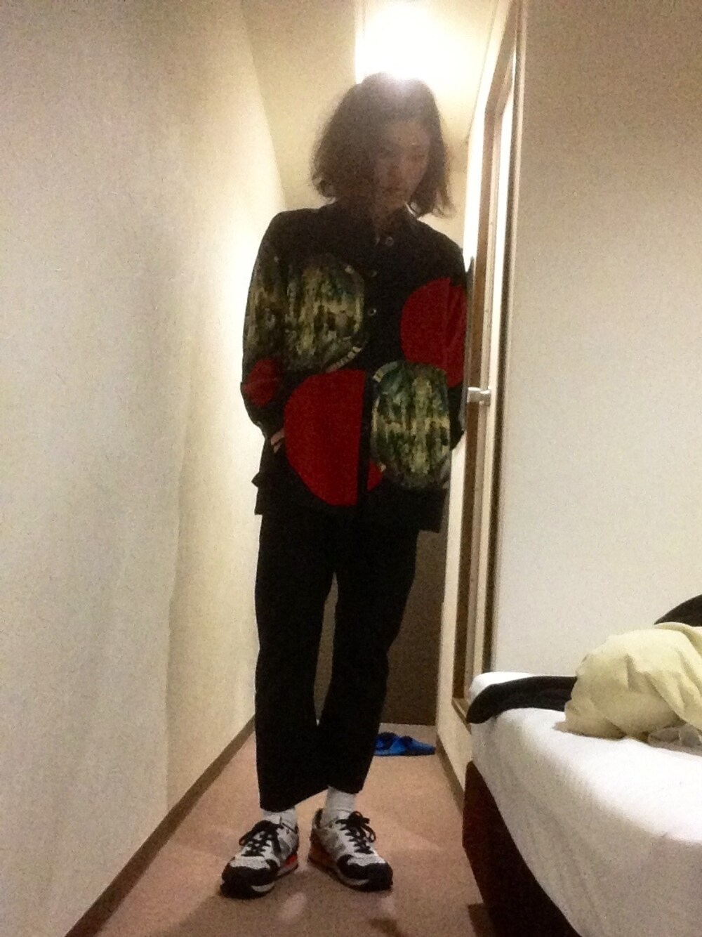 合宿免許2日目のコーディネートです。 シャツはノーブランドですが、個性的なデザインでとても気に入っています。月の中にニューヨークのビル群が建ち並ぶ幻想的なデザインです。