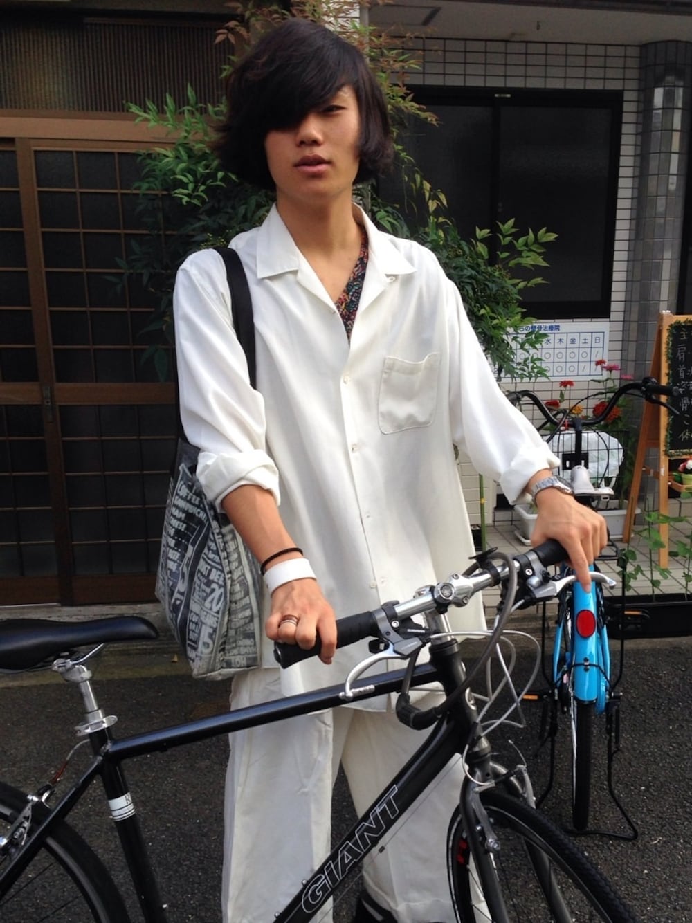 廃墟の前でのコーディネートです。 Y'sの上下でかなり大きめに着ています。