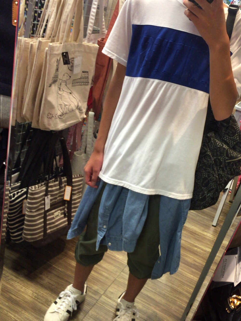 ポイントは腰に巻いてあるシャツです! 普通に着るのもいいですがズボンがこの色のため明るさを出すために巻いてみた所かなりよくなりました!!靴も白ベースなのでオススメです^^