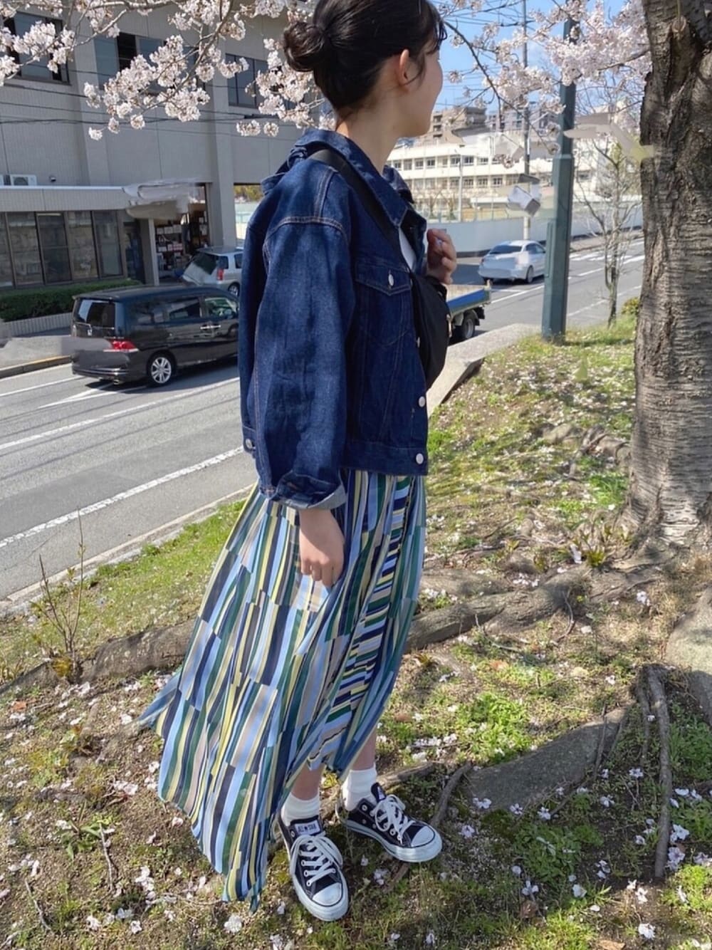 桜を見てきました🌸スカートがすごく面白い形で中はタイトスカートでボーダーなんだけど周りのオーガンジーはストライプ!!笑色も鮮やかでなかなかこのデザインは見かけなかったので試着して即決✊💚いつも私は優柔不断でなかなか決めれないので初めに行ったお店で決めれたのは滅多にないです笑
