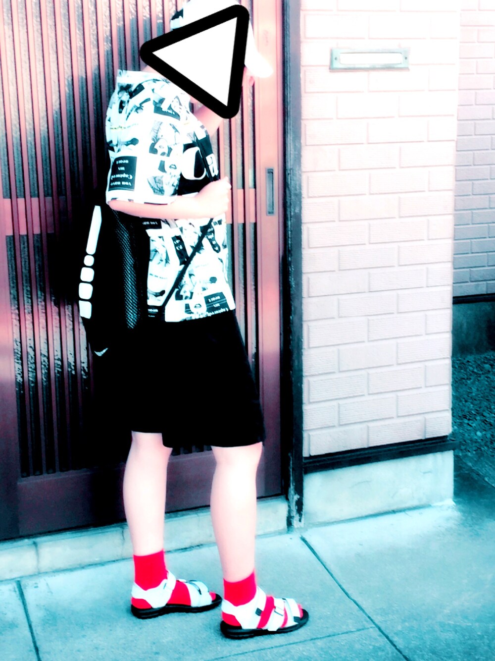 白のローキャップはお気に入り。 サンダルに赤のソックスを合わせてみました。(塾帰り)