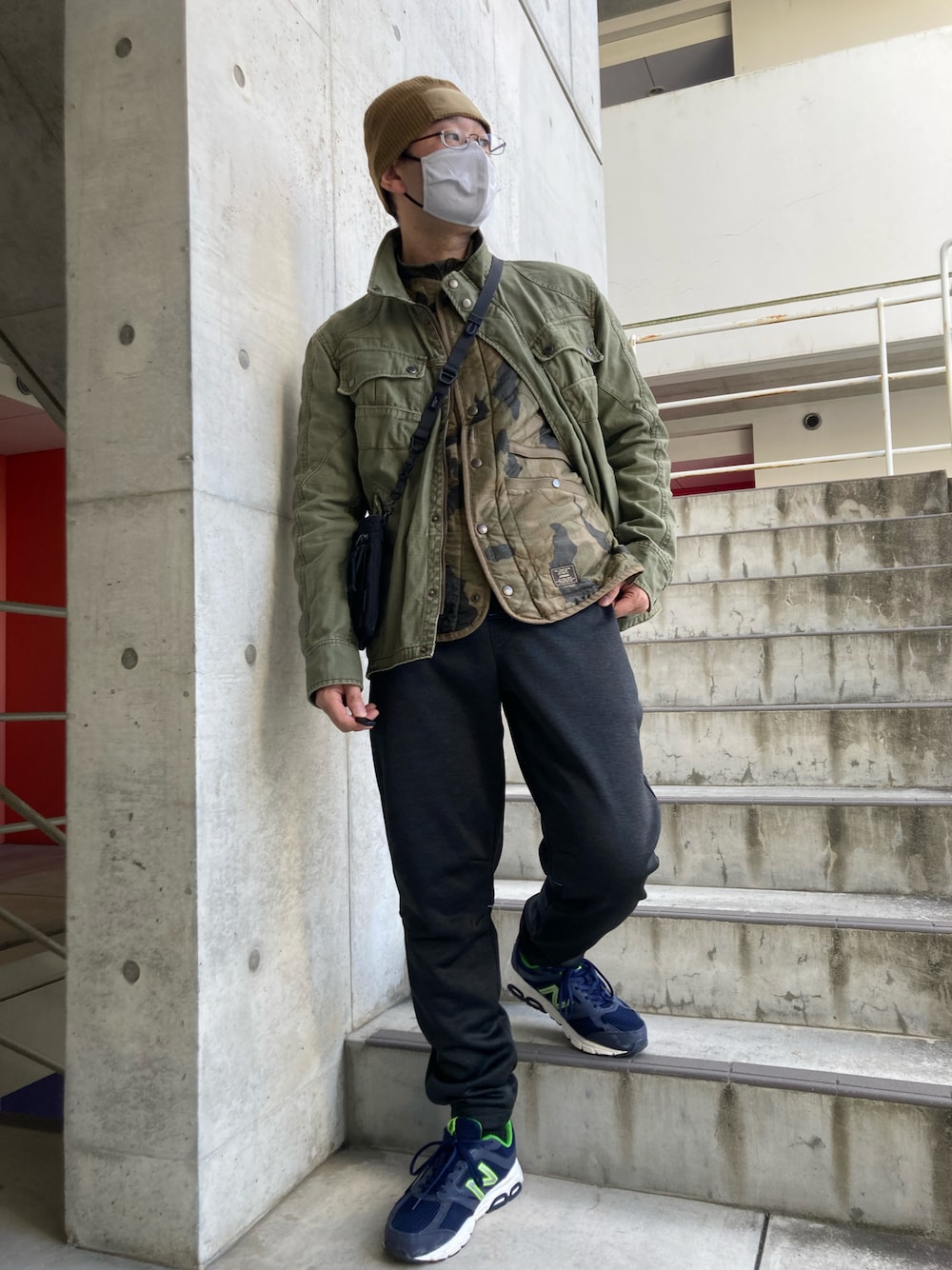 今日はお夕飯の買い物に出る時の服装です♪ 上から、HELIKON-TEXのフリースキャップ、briefingのマスク、AVIREXのM-51、johnbullのインナーダウン、ワークマンのパンツ、NEW BALANCEの461、です。