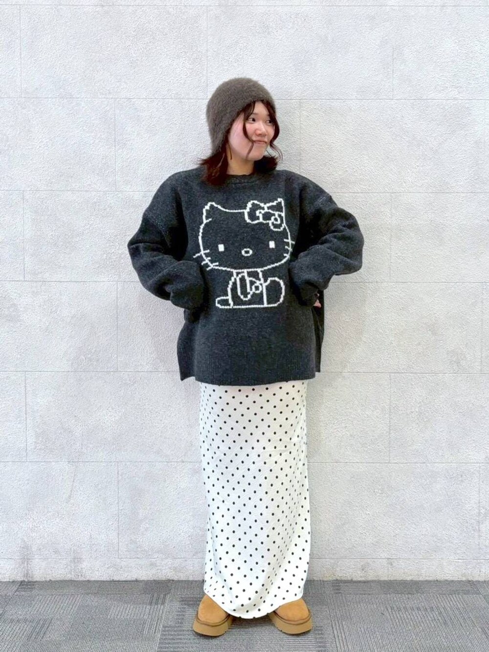 投稿ご覧頂きありがとうございます❣️ いちご新聞コラボ🍓 キティちゃんのニットは、ゆったりとした作りになっており重ね着やオーバーな感じで着ても◎!! シンプルなデザインなので、ボトムスはデニムでもスカートでも相性は抜群なニットになってます!!