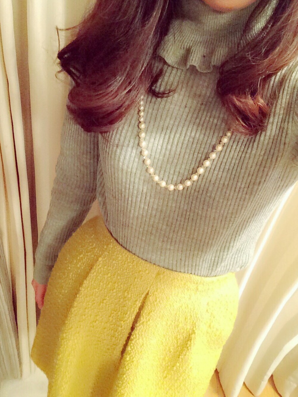 お仕事着だけど、やっぱり可愛くしたい! 首元のフリルで普通だけど ちょっぴりかわいく❤️ グレー × イエロー