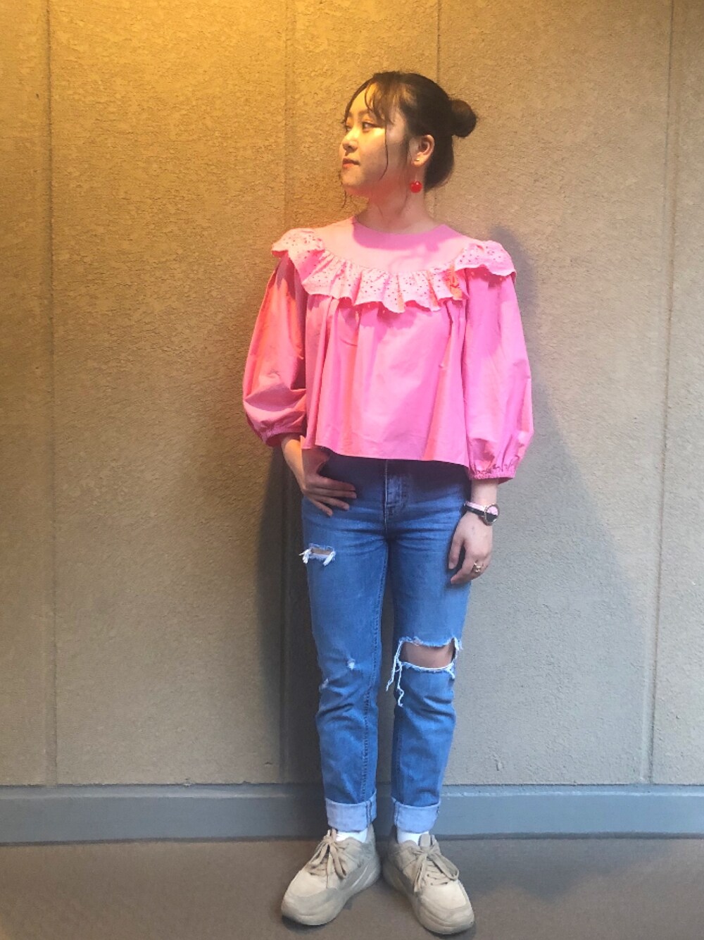 フリルが可愛いZARAのブラウスに、ヘビロテしているダメージデニムを合わせました💗 おだんごヘアに、真っ赤なさくらんぼが目立ちます~🍒