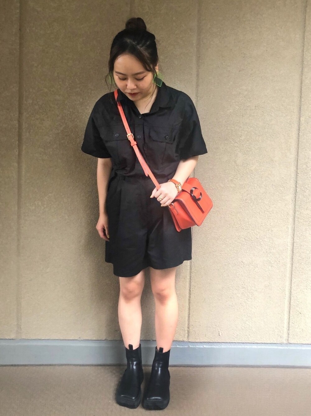 今日は雨が降っていたのでブーツを履いちゃいました☔ スクエアすぎるシルエットが最高です👢 黒のオールインワンに、差し色にオレンジのバックと蛍光グリーンのピアスをつけました🐸 まるで探検隊!!🕵🏻♀️笑