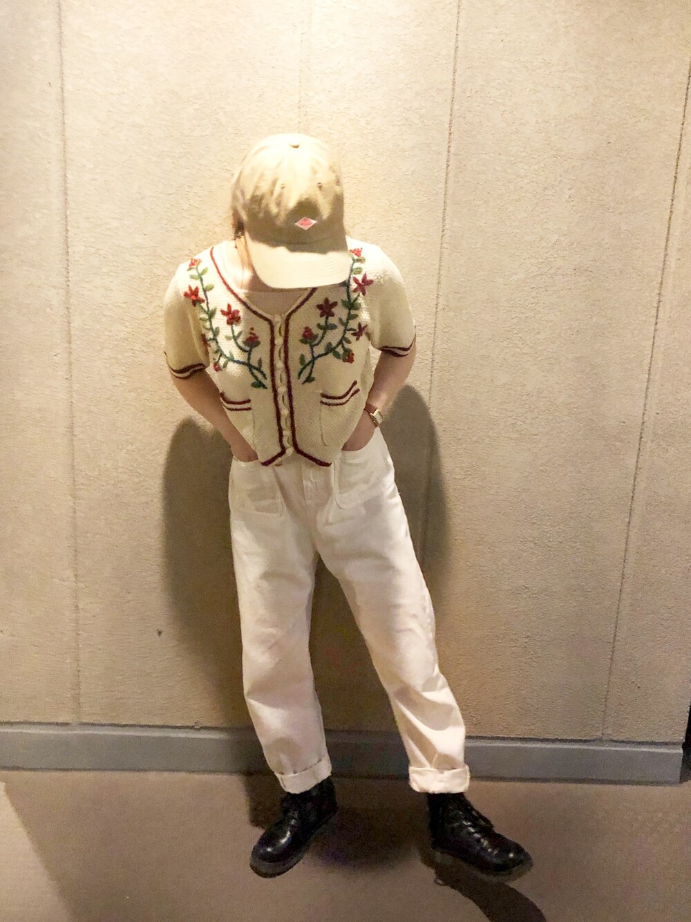 お花の刺繍がかーわいーー🥰 ゆるめの白デニムにワークブーツの組み合わせでバランスよく🥾 キャップもベージュで淡めコーデです☁️