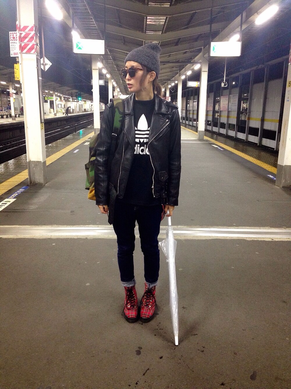 雨の日に急遽買った100均のニット帽が意外と活躍してくれました。 ただ雨の日にレザーライダースを着た私はバカです。 カモフラ柄のリュックはVISIONです。 RODEOのデニムはえりなさんオススメのサルエル風デニムでお気に入り☺︎