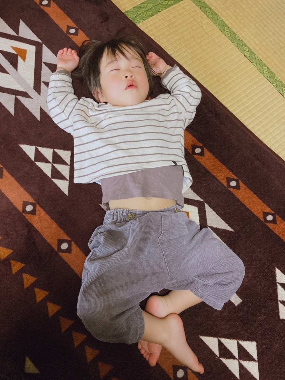 初めまして&おはようございます☺︎ お昼寝中の息子さんです💤 寝てる時がシャッターチャンス!!✨ 起きてる時は構えると駆け寄ってくるのでなかなか撮れません💧 今回はおこもりスタイルでラフな感じに🏠 サロペットとセットのボーダートップスを単体で着せました♪ セット商品ってお買い得でいいですよね〜♬