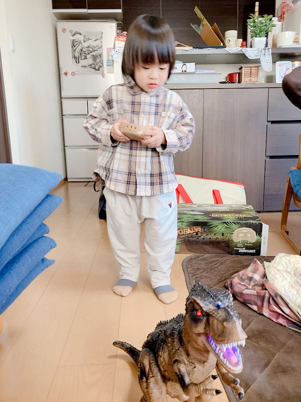 初めまして&おはようございます♔ 恐竜のおもちゃに大興奮な息子さん 実家に帰って家族大集合の日 兄家族から誕生日のプレゼントに頂きました✨✨ もらってからずーっと遊んでます🎶 今までで一番喜んだプレゼントでした(*´∀`*)