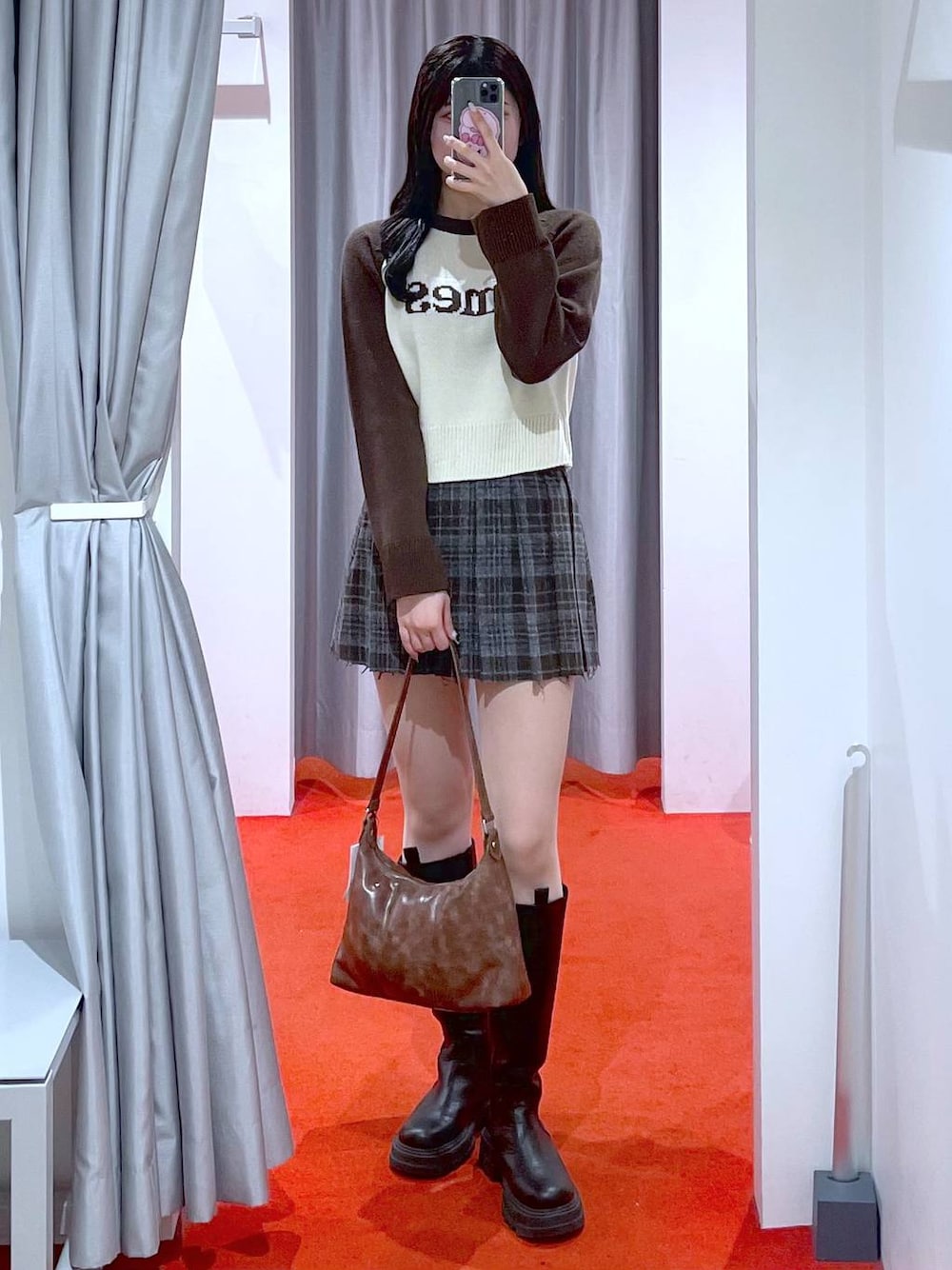 Amesの新色ブラウンのニット🤎🤍 冬のミニスカートにロングコートの組み合わせがとっても可愛いです! コートもゆとりのあるシルエットなので、中にも着込んでいただけます!!