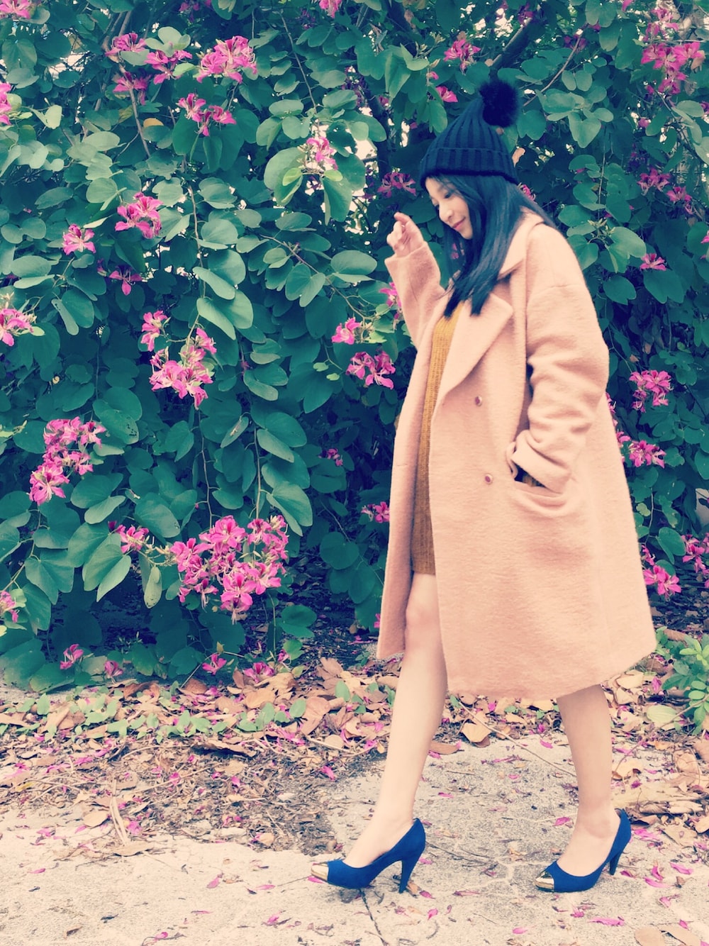 ブラウン系のチェスターコートを着用したレディースの冬コーディネートの1枚目の写真