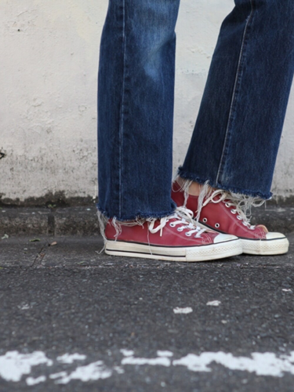 Levi's 501レギュラーデニムのフリンジパンツに足元はコンバースmade in USA. お色はマルーンのレザーです。