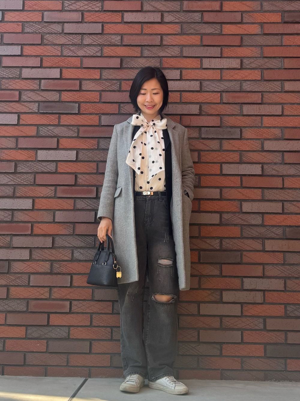 セーラームーン期後の低迷期辛い🫠が気持ちだけでも明るく🫧セカストdigで見つけた水玉のボウタイは去年から大活躍🖤🤍 黒、白、グレーのワントーンでまとめました👖 お家より外のがあたたかい☀️✨春もすぐそこですね🌸 3/20(㊗︎Fri)に駒川商店街内のコマステーションというレンタルスペースで10:00〜17:00までマルシェやります🎪オリジナルポストカードと数量限定ハンドメイドアクセサリー販売しゃす🌷 WEARで告知してるかた見たことないですが、近隣にお住まいの方の目にもし留まればと🦋