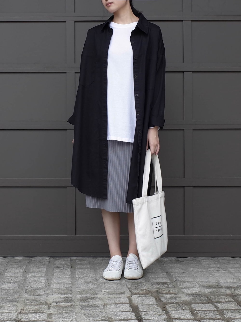 ブラック系のトップスを着用したレディースの秋コーディネートの1枚目の写真