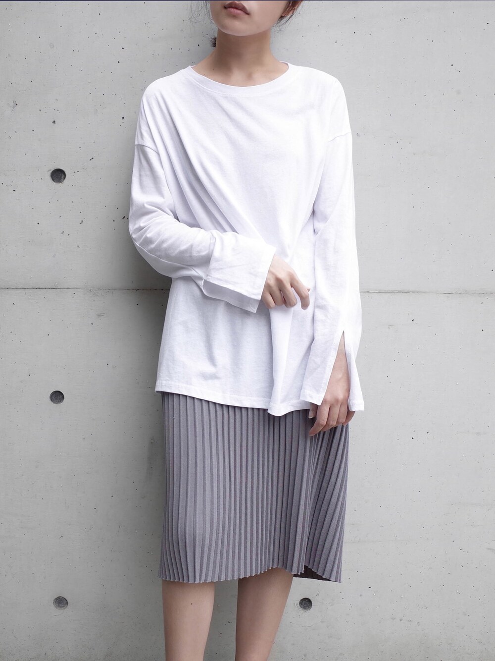 グレー系のスカートを着用したレディースの秋コーディネートの1枚目の写真