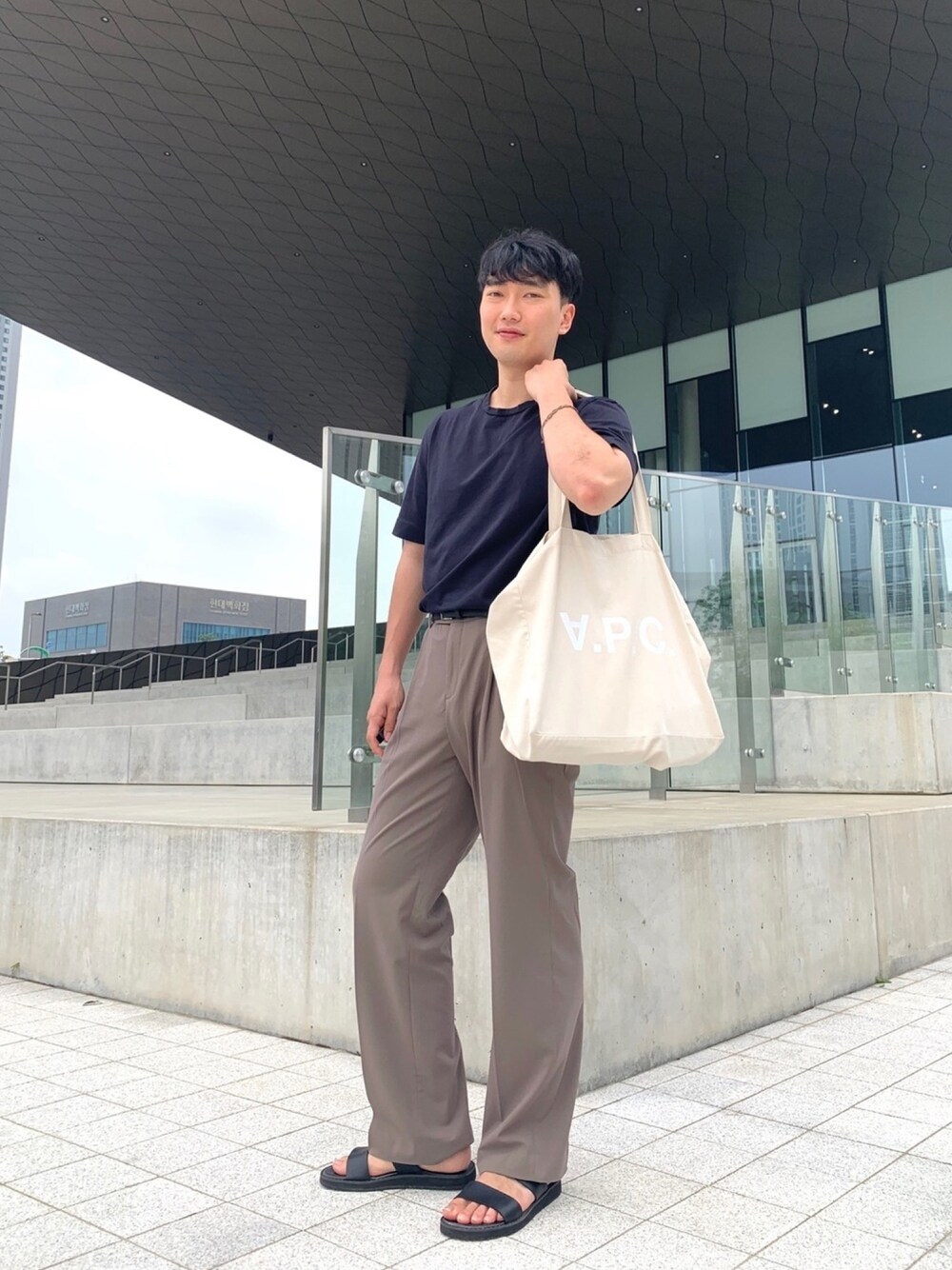 ブルー系のTシャツ/カットソー、ベージュ系のエコバッグ/サブバッグを着用したメンズの夏コーディネートの1枚目の写真