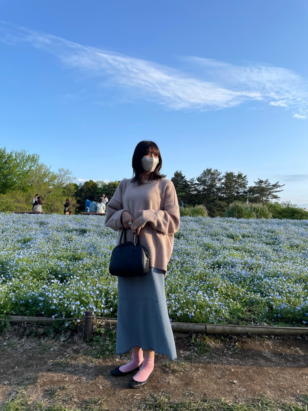 🌷 . お花見コーーーデ! ニットのシルエットがかわいすぎんだあ ピンク×ブルー。
