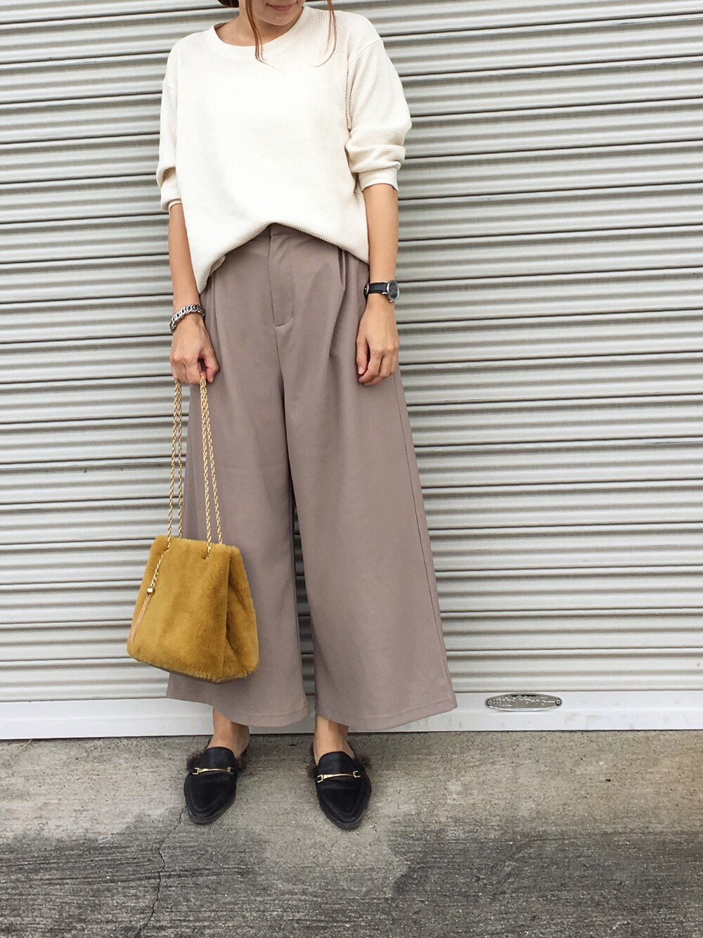 お気に入りのファーバッグ👜 イエローがポイントになって使えます😍✨ ベージュの絶妙な色味が可愛いワイドパンツはチビな私でもキレイに履けました♡
