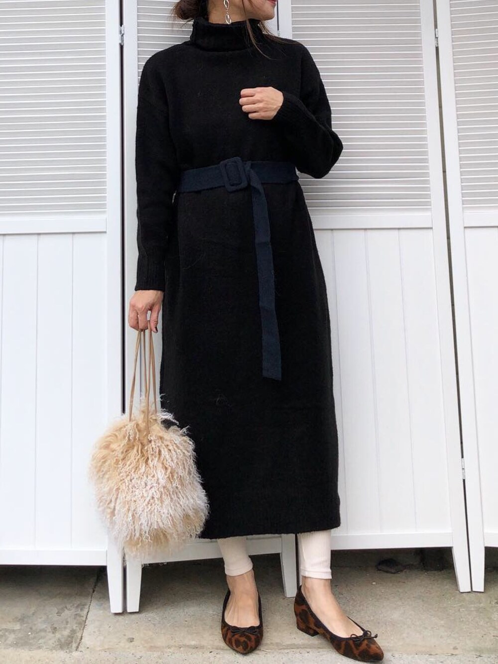 moyooonnのワンピース「<高橋愛さんコラボ>ラブ&ピースプロジェクト 配色ベルトのタートルニットロングワンピース」を使ったコーディネート