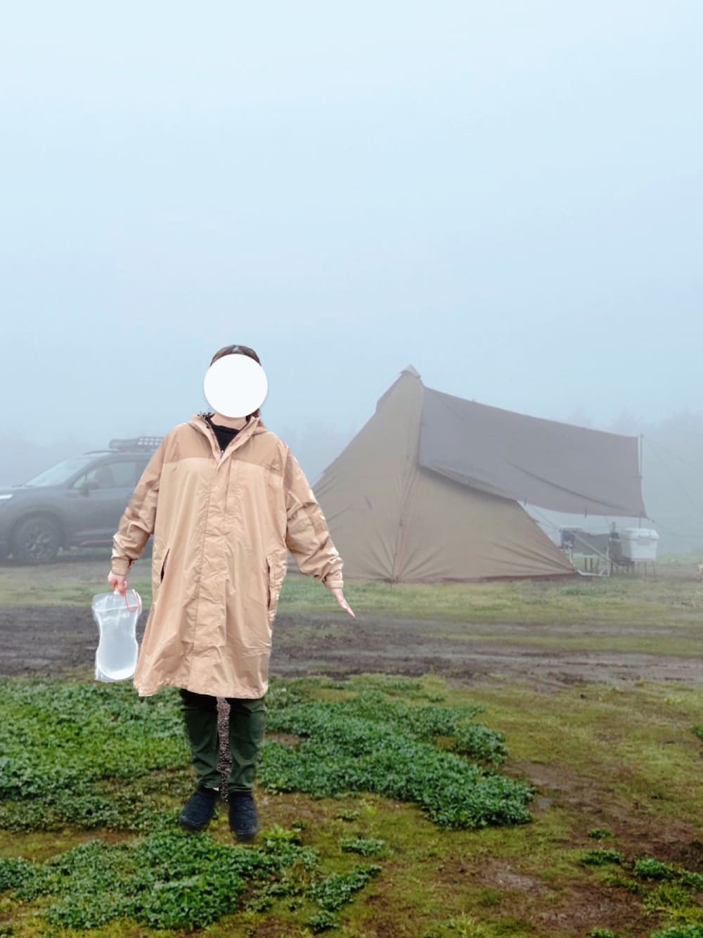 キャンプに行ったけど雨だったので ワークマンのレインコート?を着たところです☔️ 中は2021年のフジロックのスウェット(黒)です、 とても良い🐦⬛ なんだか合成感がありますが そうです、iPhoneの切り抜き機能を使って うまく撮れた背景に貼り付けました✂️