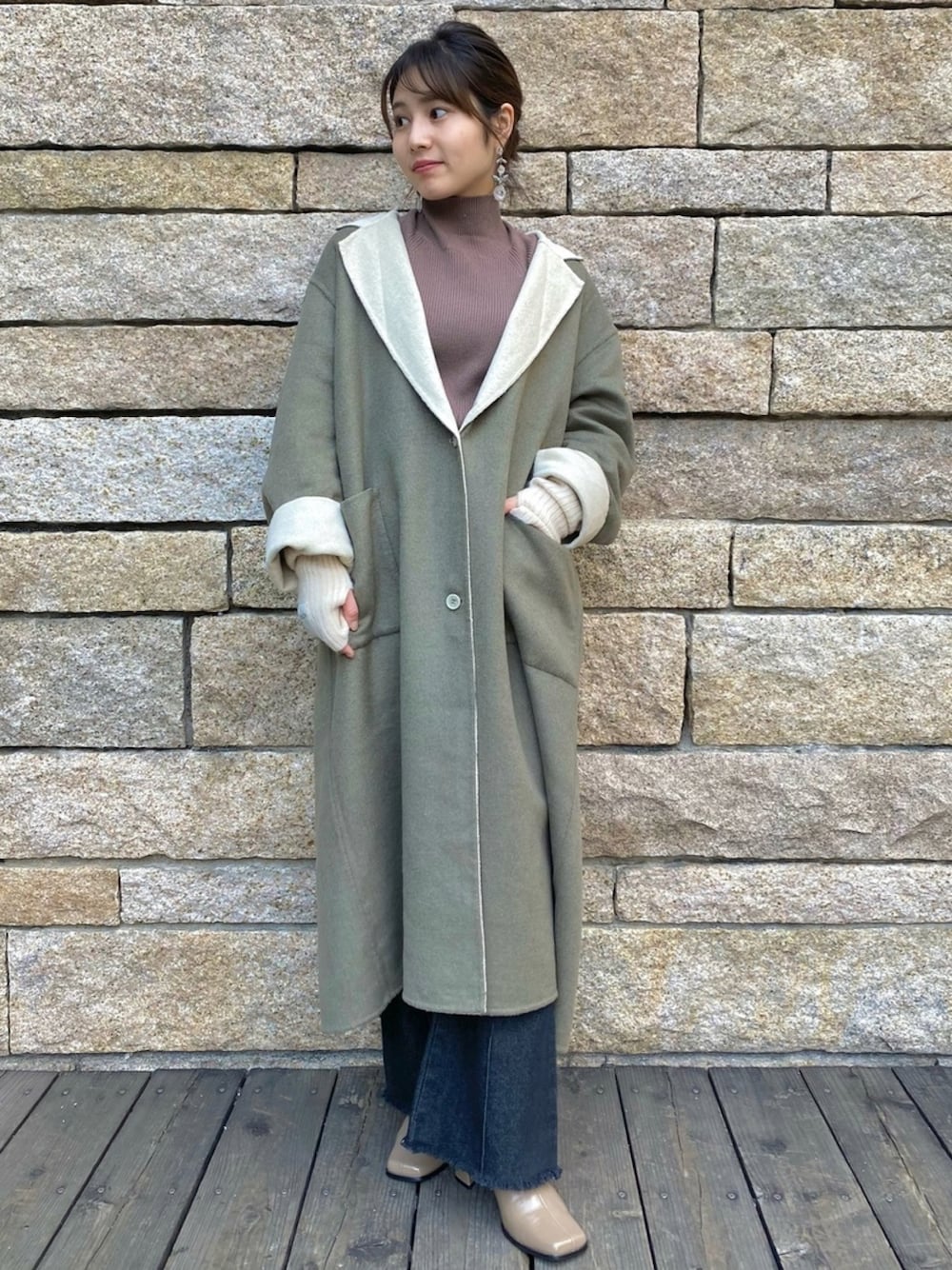 momoco(Kastane姫路店)のチェスターコート「リバーシブルチェスターロングコート」を使ったコーディネート