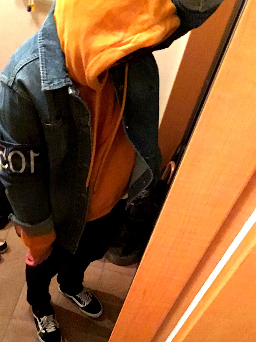 高円寺のa.m.m.sというお店でGジャンとパーカーは買いました Gジャンの腕についてる105のワッペンお気に入りです。 Gジャンの袖をまくりパーカーの袖を出してます。