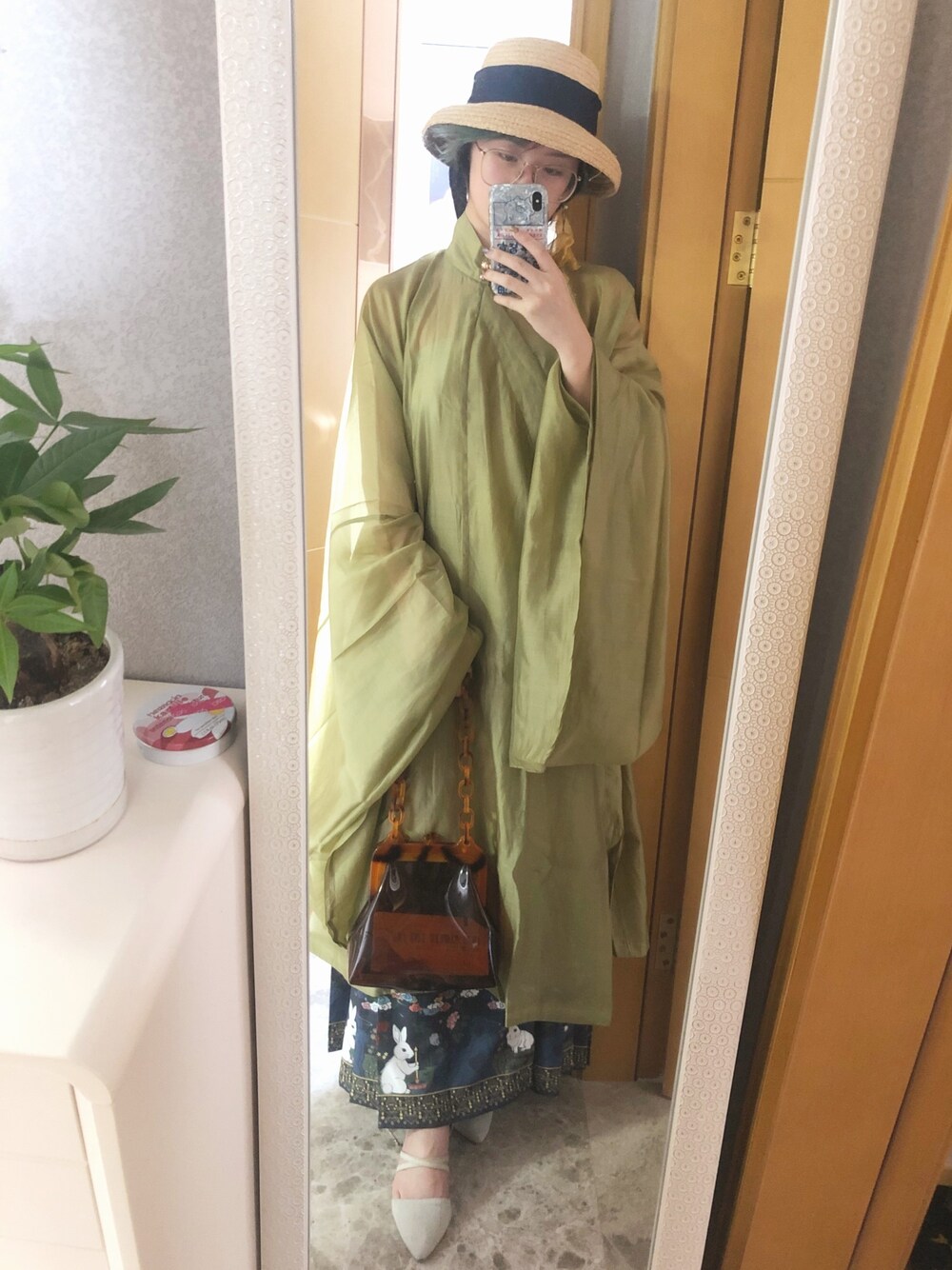 グリーン系のトップスを着用したレディースの秋コーディネートの1枚目の写真