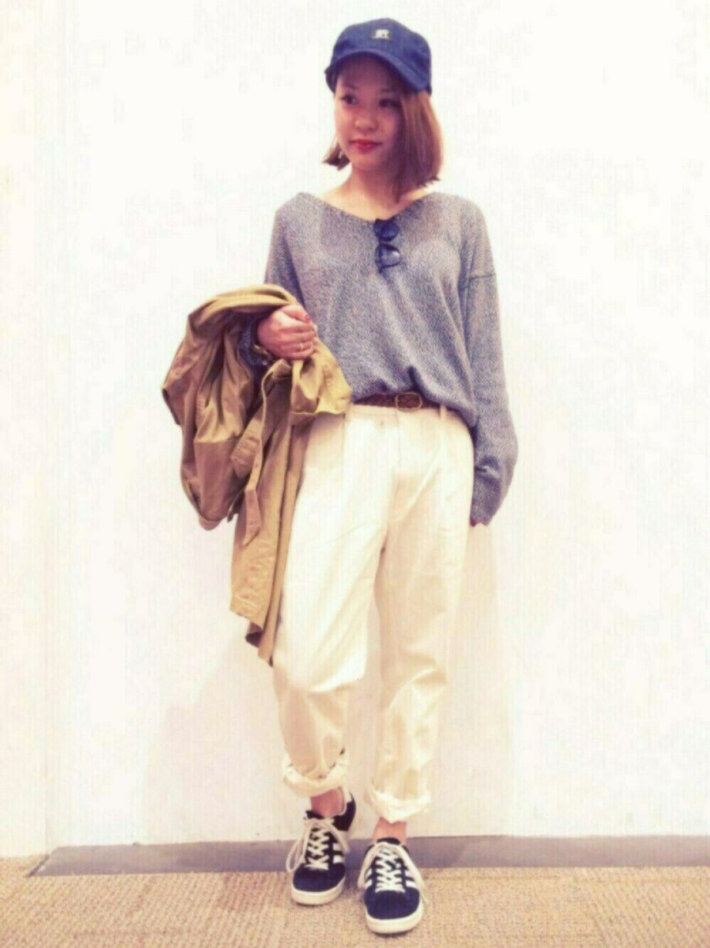 ゆるニット×白パンツで春コーデ♪ 最近キャップにハマってます!