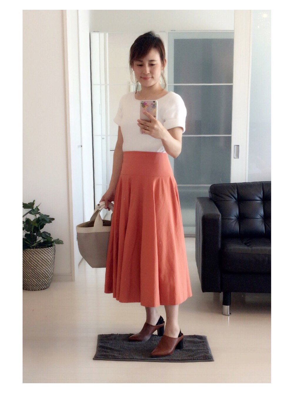 ホワイト×オレンジの#ユニクロコーデ ♪ * こんにちは(^^) 今日は#ユニクロユー のオレンジ色のスカートを着ました。 明るくくすんだ柔らかいオレンジ色で、今日みたいな快晴の日に着たくなる色です♡ * トップス#naturalbeautybasic スカート#uniqlou #シアサッカーラウンドスカート バッグ#hervechapelier #707gp パンプス#gu